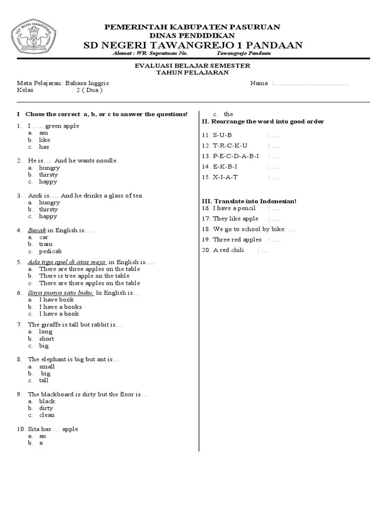A music collection from any artist, which of course will save you a lot of time. Bahasa inggris smt 2 sd. Sebagai materi tumpuan guru dalam menciptakan materi naskah soal ujian tengah semester admin disini akan membagikan soal kelas 2 semester 1 untuk mata . Soal yang admin bagikan ini terdiri dari beberapa bagian, nah setiap bagian . Berikut ini adalah contoh latihan soal uts bahasa inggris kelas 2 semester 2 terbaru tahun ajaran 2017/2018 plus kunci jawaban.