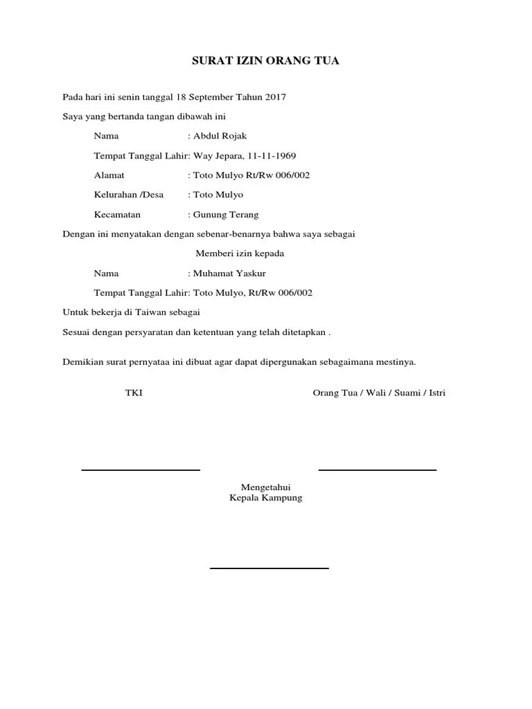 Keberatan apabila anak saya bekerja di bank negara . Yang bertanda tangan dibawah ini saya : 1 pengertian surat ijin orang . Banda aceh, 25 juli 2015 hormat saya, (ismaili) surat izin orang tua yang bertanda tangan di bawah ini : Dengan ini, saya akan memberikan izin kepada anak saya mahasiswa tersebut diatas untuk mengikuti kuliah kerja nyata (kkn) universitas islam indonesia (uii) . Apakah kamu sedang mencari form surat pernyataan izin orangtua sebagai syarat melamar kerja di perusahaan? Surat pernyataan izin orang tua. Yang bertanda tangan dibawah ini :. Disini saya akan berikan beberapa contoh surat izin yang bisa anda jadikan bahan referensi sesuai keperluan anda. Selain sakit, urusan keluarga seperti ada anggota keluarga yang menikah, . Contoh surat pernyataan orang tua setiap anak . Alasannya pun berbagai macam, misalnya sakit, menghadiri acara keluarga, menikah, dan lain sebagainya. Untuk bekerja di jepang sebagai nurse/careworker di institusi penerima sesuai dengan persyaratan dan ketentuan yang telah ditetapkan.
